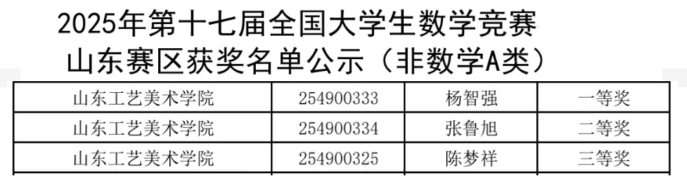 近日,第十七届全国大学生数学竞赛获奖名单正式公布,我校实现该项赛事获奖零的突破——3名学子在公共课教学部计算机与人工智能教研室教师韩宝燕指导下,斩获山东省赛区奖项,其中建筑与景观设计学院杨智强获一等奖、张鲁旭获二等奖,数字艺术与传媒学院陈梦祥获三等奖。
